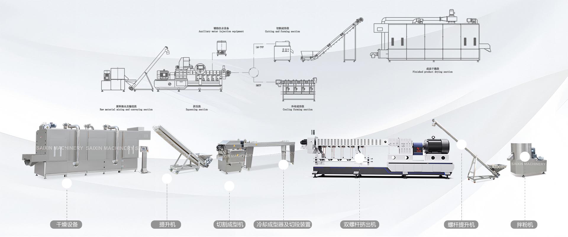 高水分植物蛋白生產(chǎn)線以大豆分離蛋白等植物原料為基礎,采用擠壓膨化或高水分擠壓技術生產(chǎn)結(jié)構(gòu)化植物蛋白(如大豆拉絲蛋白,TVP)。該類產(chǎn)品具備類肉纖維質(zhì)感,在植物基食品領域具有廣泛應用,滿足多樣化的營養(yǎng)需求和飲食偏好。