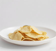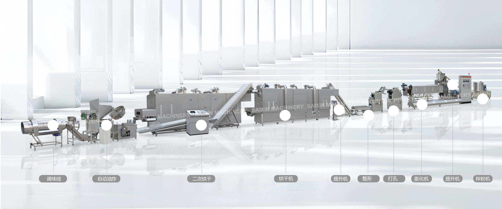 該生產(chǎn)線以玉米淀粉、面粉、馬鈴薯粉等谷物為主要原料,通過混合攪拌后將原料加入單螺桿擠壓機,利用模具和成型設備生產(chǎn)出各種形狀的產(chǎn)品坯料。經(jīng)過干燥、油炸、調(diào)味等工藝流程,最終,生產(chǎn)出多種形狀的膨化食品,如洋蔥圈、網(wǎng)格脆等。