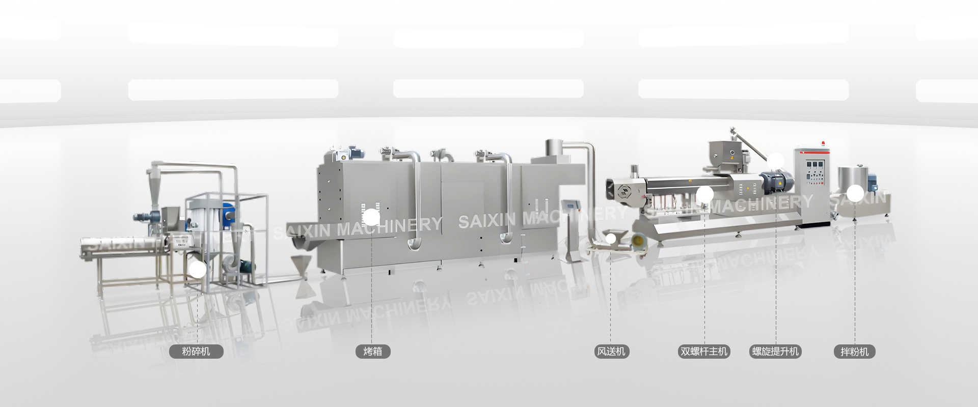 本營養(yǎng)米粉生產(chǎn)線采用玉米粉、大米粉、糙米粉和五谷雜糧粉等為主要原料,經(jīng)過混合、擠壓膨化、干燥、粉碎等多道工藝,生產(chǎn)出膨化米粉產(chǎn)品。膨化米粉可廣泛用于代餐食品、嬰幼兒米粉等,也可作為糕點產(chǎn)品的原料,還可用于飼料加工等行業(yè)。